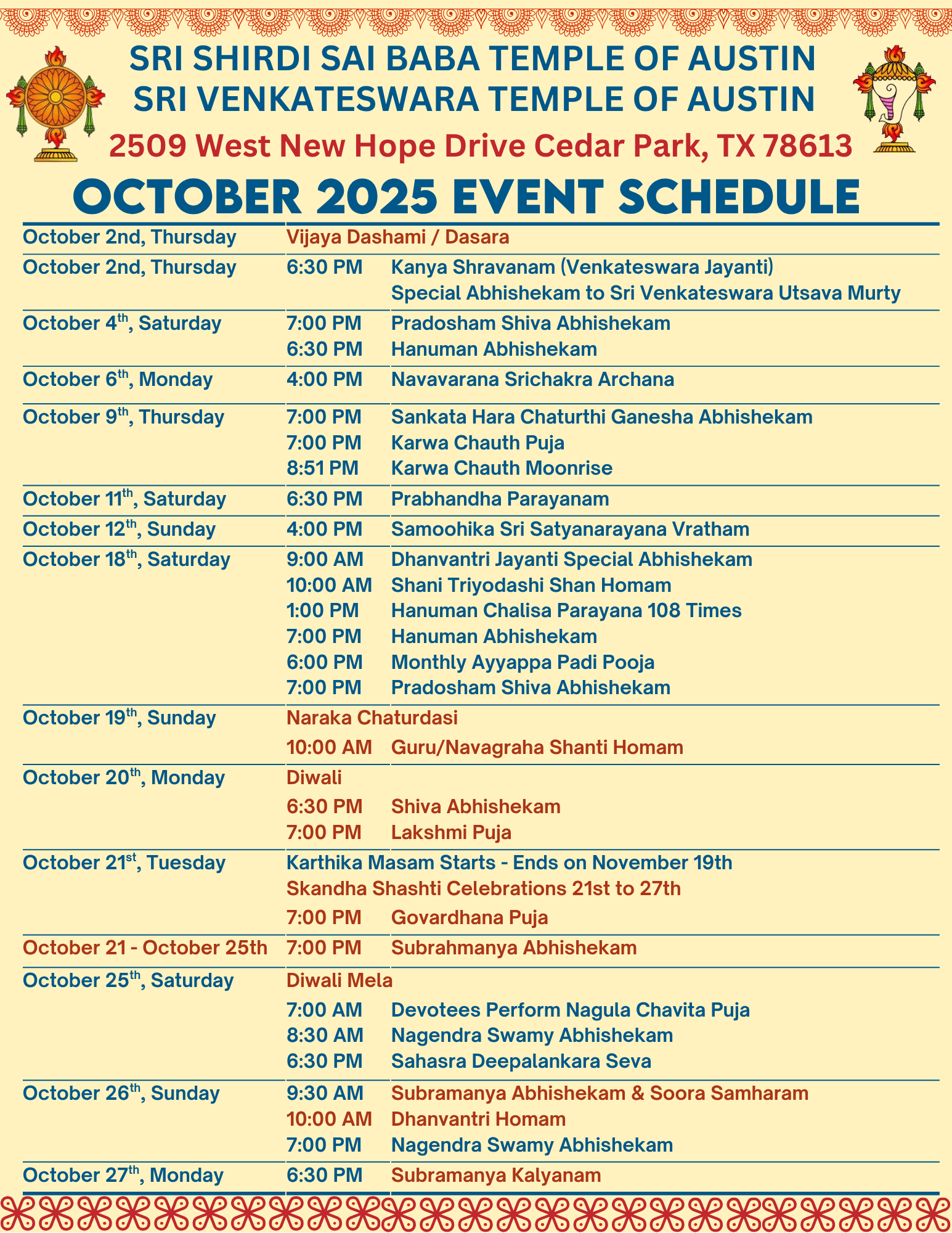07:00 PM | 12:00 PM | Ganapati & Ayyappa Abhishekam |